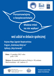 Wysokomazowieccy policjanci serdecznie zapraszają na wspólne rozmowy o bezpieczeństwie podczas debaty społecznej. Debata odbędzie się w dniu 12 grudnia 2025 roku o godzinie 08.30 w Komendzie Powiatowej Policji w Wysokiem Mazowieckiem ul. Ludowa 13.